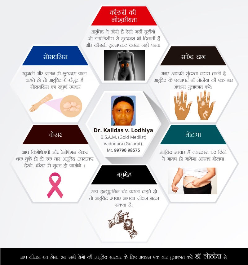 Mr.Kalidas Lodhiya has vast 34 years of experience In Ayurvedic and Gold medalist from Gujarat University, Jamnagar and studied in Sheth G P Ayurvedic Collage at Bhavnagar. We had several example for the recovered of non curable deases.