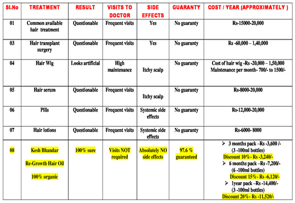 Q.1 Why choose Kesh Bhandar Regrowth Hair Oil? Ans- Kesh Bhandar Regrowth Hair Oil is by far the most effective, clinically proven, organic hair regrowth oil that gives guaranteed results without any side effects. Q.2 IsKeshBhandar Regrowth Hair Oil organic? Ans-Yes, KeshBhandar Regrowth Hair Oil is prepared using purely natural ingredients including various essential oils and organically cultivated herbs. Q.3 Is there any side effect on long term use of KeshBhandar Regrowth Hair Oil ? Ans- Absolutely no, there are no side effects upon using KeshBhandar Regrowth Hair Oil even for long duration. It is clinically tested with proven results with no side effects. This is because KeshBhandar Regrowth Hair Oil does not contain any harmful chemicals such as colouring agents and preservatives which are usually responsible for itchy scalp and other side effects. Q.4 Can KeshBhandar Regrowth Hair Oil use by men and women? Ans-Yes, it can be used by men and women and is equally effective in both. The formulation is such that, the pure and natural content in the oil does not have any systemic side effects including hormonal changes in women. Thus this can be safely used by women too. Q.5 At what age KeshBhandar Regrowth Hair Oil most effective? Ans- KeshBhandar Regrowth Hair Oil can be used at all ages above 7 years. Q.6 Can this KeshBhandar Regrowth Hair Oil be used for regrowtheven after 50 years of age? Ans- Yes, it can be used. Rather than the age of the patient, what is important is the duration of bald patch on the scalp.Shorter the span of bald patch, faster is the hair regrowth..However, clinical trials show that with continuous and regular application there would be definite results although it may take a little longer. Q.7 How long does it take to get new hair growth? Ans- Regular use of KeshBhandar Regrowth Hair Oil will definitely give 100% results. Q.8 How to apply KeshBhandar Regrowth Hair Oil? Ans- Apply Kesh Bhandar Regrowth Hair Oil to the Scalp everyday and gently Massage the Scalp in a circular motion using finger tips for a minimum of 15 to 20 minutes. Leave overnight and wash with any natural herbal shampoo Q.9 How frequently one should apply KeshBhandar Regrowth Hair Oil? Ans- For best and guaranteed results, one must apply KeshBhandar Regrowth Hair Oil