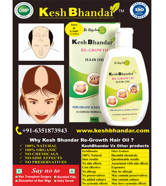 About, Kesh Bhandar Re-Growth Hair Oil:Kesh Bhandar Re-Growth Hair Oil At keshBhandar , we believe that mother nature has vast treasure ( Bhandar ) of organic herbs, that can treat all natural elements of mankind. KeshBhandarhair oil products were developed after several years of research using various permutations and combinations of organic herbal oils and extracts. These oils are actually formulated for our own personal use to combat hereditary alopecia and dandruff problems. After getting unbelievable results in ourselves and other family members, friends and neighbours - The thought of making it available for others with similar hair problems was conceived. KeshBhandar hair oil products are 100 % natural and organic formulations having unique mixture of several rare essential oils and herbal extracts with no chemicals ,no preservatives ,no colouring agents and thus do not cause any hormonal imbalance and other side effects . KeshBhandar hair oil products are prepared with utmost care using aseptic precautions and packed in virgin bottles of standard quality. Our promise is to be regular in use and get 100 % sure results. In today’s fast paced competitive world, personal calibre intelligence also appearance is important for self-confidence and once career, social life etc . Alopecia in men and women mainly due to hereditary pattern baldness can become serious issue especially to a sensitive person and may impact even his/ her quality of life.